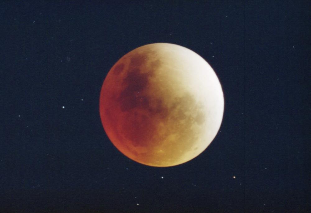 Lunar Eclipse April 3, 1996 Very bright eclipse moon was a bright orange at totality. Viewed from my home in Wayside Maryland. Moon rose already partially eclipsed. William E. Rison