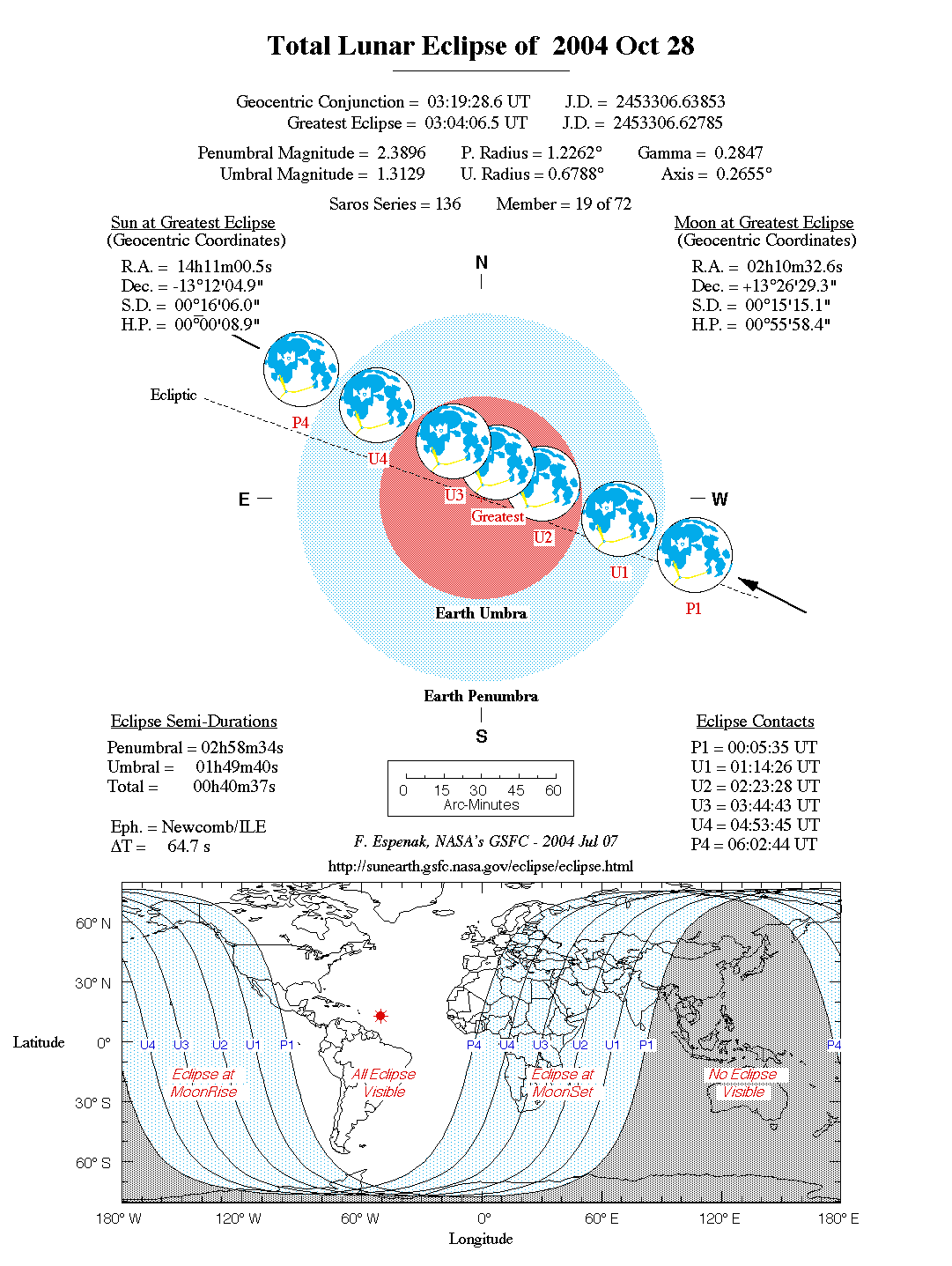 Information Charts showing where the eclipse was visible, timing of eclipse events and sky location of moon at mid-eclipse. |
