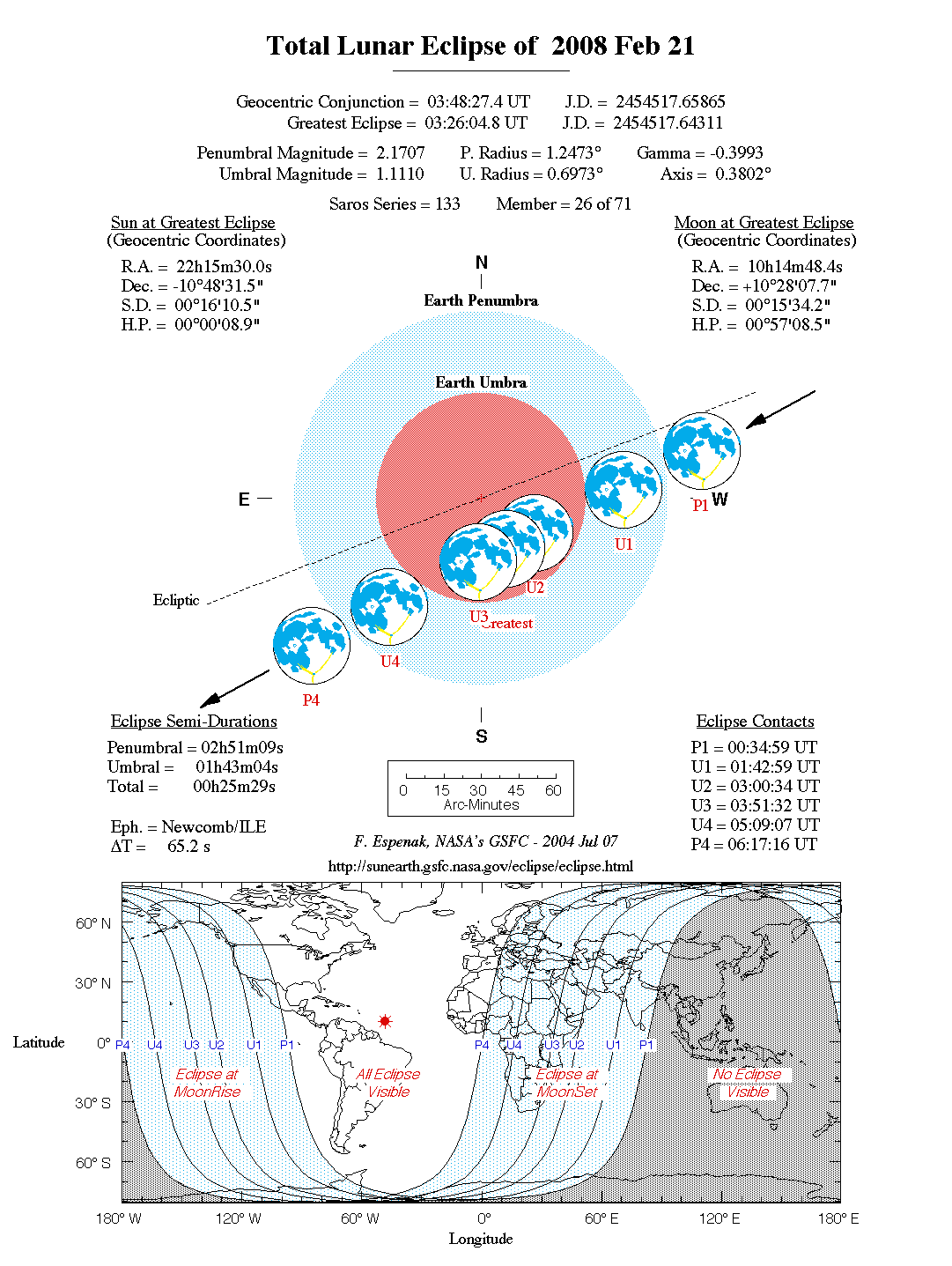 Information Charts showing the timing of eclipse events and sky location of moon at mid-eclipse. |