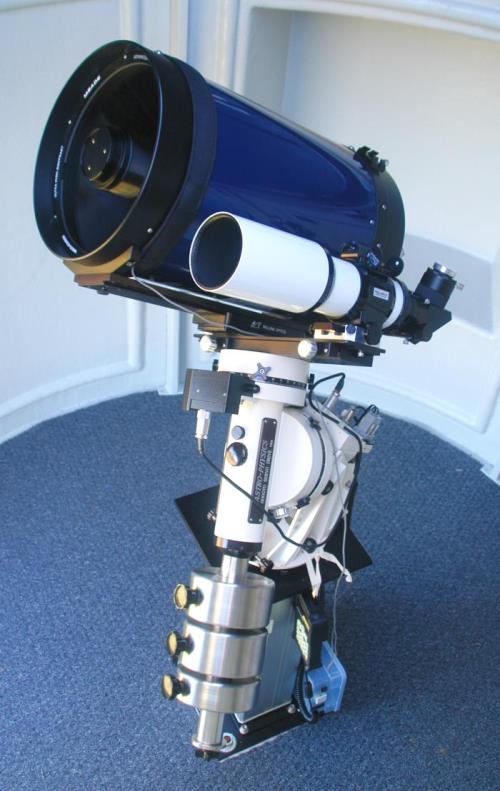![]() Meade LX200R (blue tube) 305mm (12") Advanced Rictchey-Chrétien 3048mm focal length f/10 Stellarvue SV80S (white tube) 80mm (3") APO refractor telescope 480mm F.L. f/6 Astro-Physics 900GTO equatorial mount Sirius Home model observatory, 7 1/2 feet diameter |
